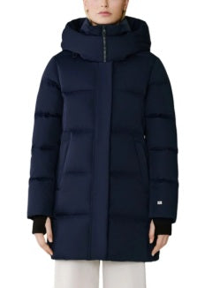 The NATALI by SOIA & KYO is a sustainable and trendy coat that extends down to the mid-thigh. This winter-must-have is filled with RDS certified down to deliver full-on warmth even on days when temps dip as low as -25 °C (-13 °F). Enveloped in water-repellent 100% recycled channel-quilted nylon fabric and finished with a hood + storm visor, rib-knit storm cuffs and polar fleece-lined pockets.